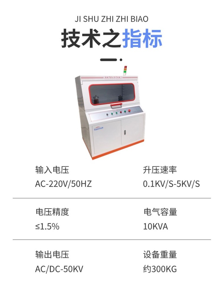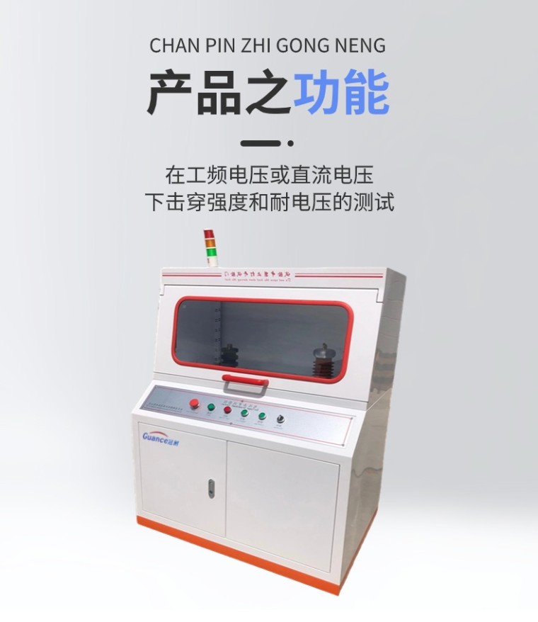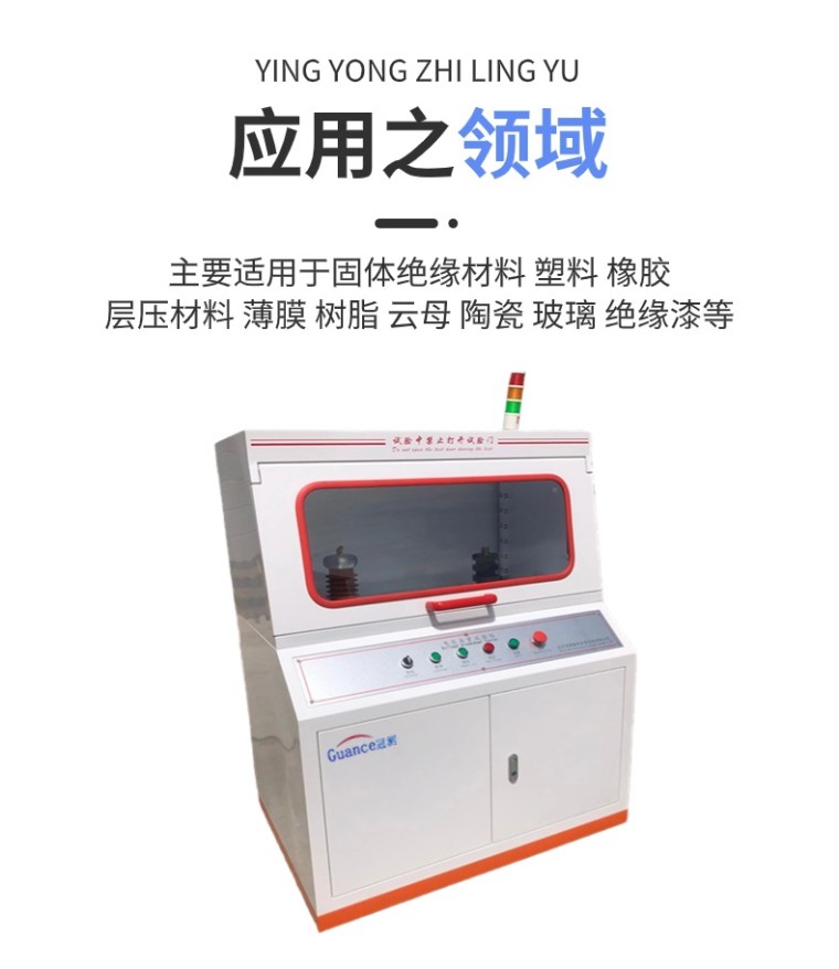 主要适用于固体绝缘材料(如:塑料、橡胶、层压材料、薄膜、树脂、云母、陶瓷、玻璃、绝缘漆等绝缘材料及绝缘件)在工频电压或直流电压下击穿强度和耐电压的测试。