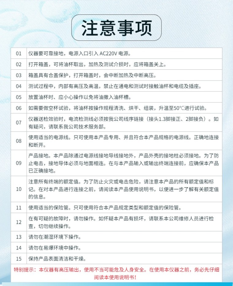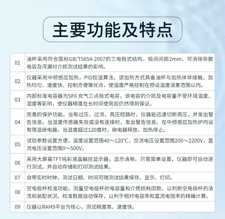(1)油杯采用符合国标GB/T5654-2007的三电极式结构,极间间距2mm,可消除杂散电容及泻漏对介损测试结果的影响。