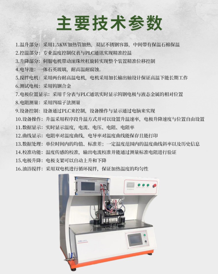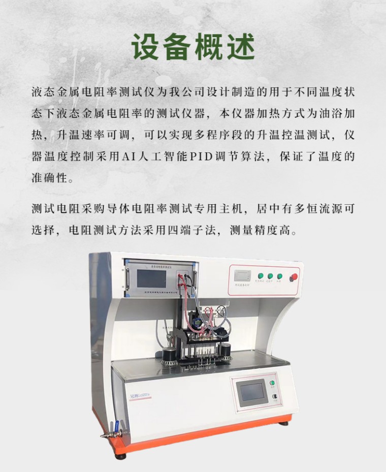 液态金属电阻率测试仪为我公司设计制造的用于不同温度状态下液态金属电阻率的测试仪器,本仪器加热方式为油浴加热,升温速率可调,可以实现多程序段的升温控温测试,仪器温度控制采用AI人工智能PID调节算法,保证了温度的准确性。