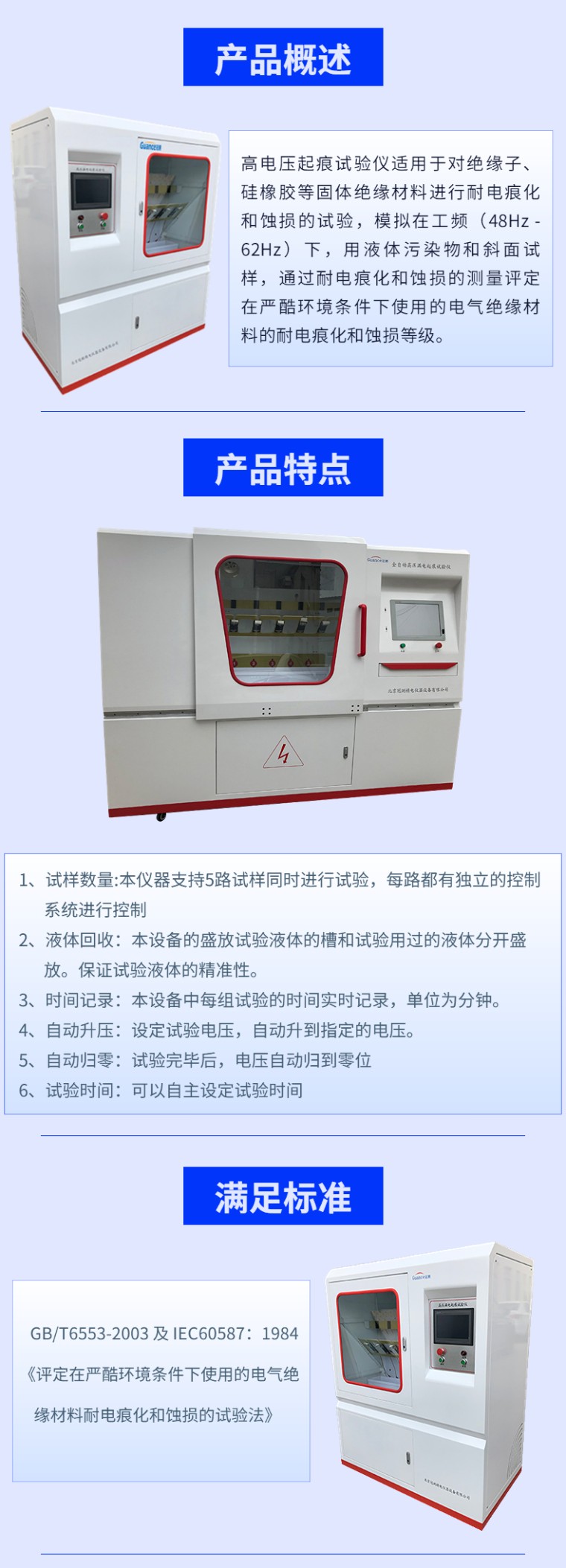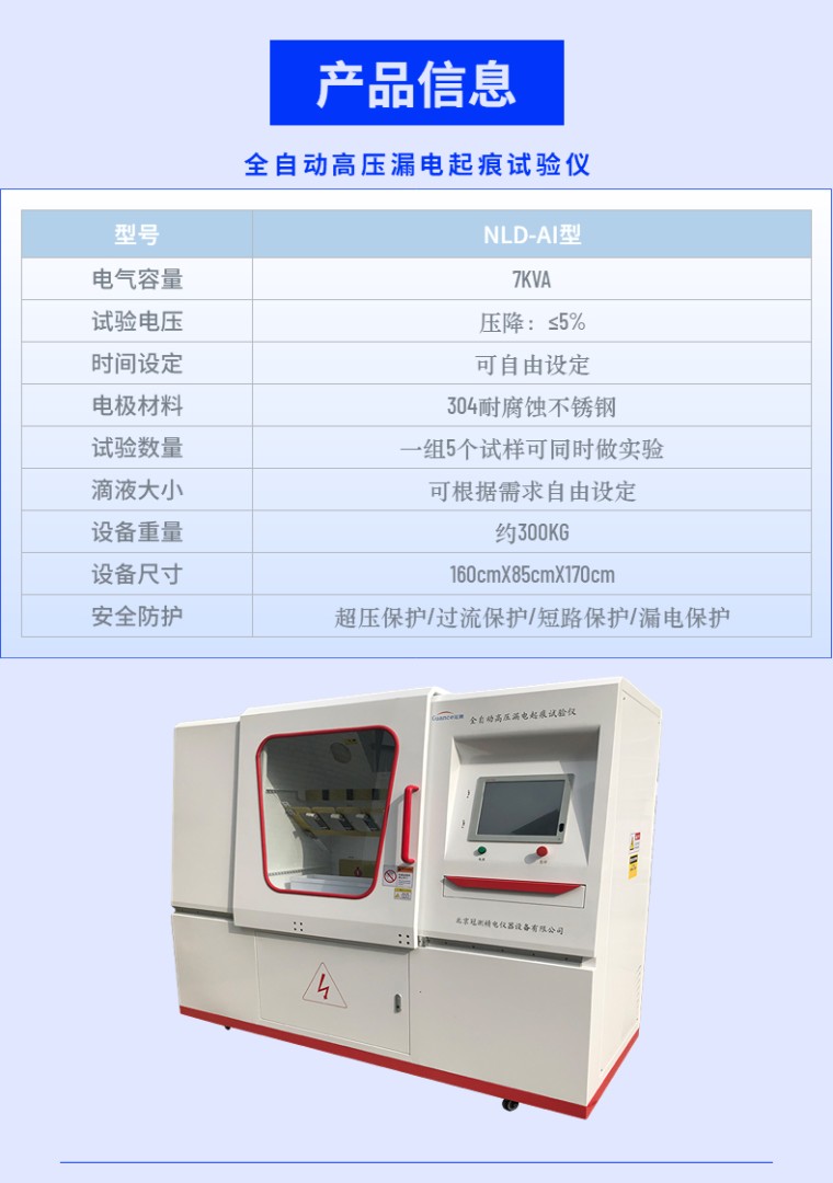 高电压起痕试验仪适用于对绝缘子、硅橡胶等固体绝缘材料进行耐电痕化和蚀损的试验,模拟在工频(48Hz - 62Hz)下,用液体污染物和斜面试样,通过耐电痕化和蚀损的测量评定在严酷环境条件下使用的电气绝缘材料的耐电痕化和蚀损等级。