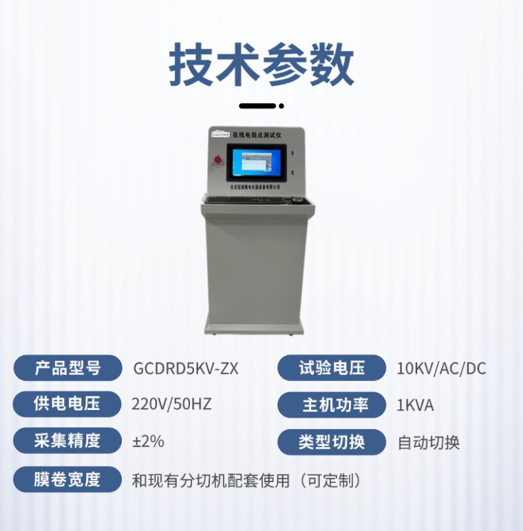 本测试仪试验电压是0-10KV直流电压,其波动为±1%。测试仪在试样弱点击穿后约0.1s内使电压回升到原来设定的电压。铜辊为下电极,导电橡胶为上电极。薄膜以2m-5m /min的速度移动,薄膜弱点时击穿,击穿点自动累积计数。膜移动以平方数自动计数。