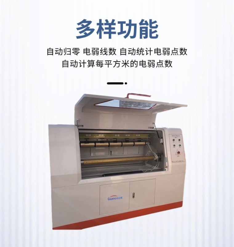 本仪器方式为微机控制,卷膜移动速度可设定,按照设定的升压速率升压,达到设定的电压后,实时记录当前的电压值和电流值,并能够实时记录当前的击穿点,试验结束后自动归零,自动统计电弱点数、电弱线数,自动计算每平方米的电弱点数。