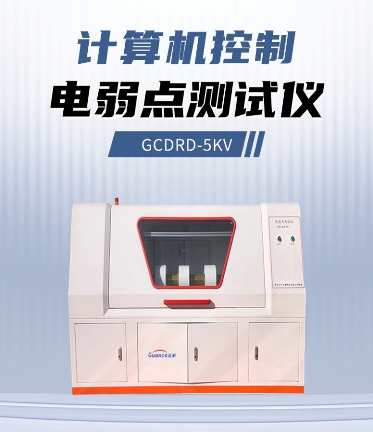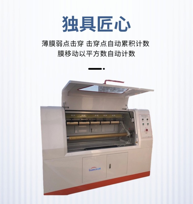 本测试仪试验电压是0-5KV直流电压,其波动为±1%。测试仪在试样弱点击穿后约0.1s内使电压回升到原来设定的电压。铜辊为下电极,导电橡胶为上电极。薄膜以2m-5m /min的速度移动,薄膜弱点时击穿,击穿点自动累积计数。膜移动以平方数自动计数。