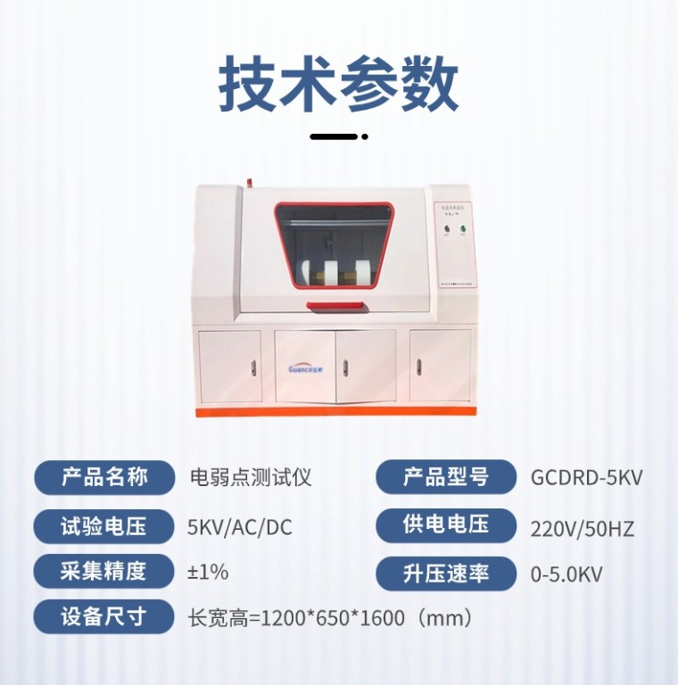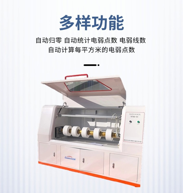 本仪器方式为微机控制,卷膜移动速度可设定,按照设定的升压速率升压,达到设定的电压后,实时记录当前的电压值和电流值,并能够实时记录当前的击穿点,试验结束后自动归零,自动统计电弱点数、电弱线数,自动计算每平方米的电弱点数。