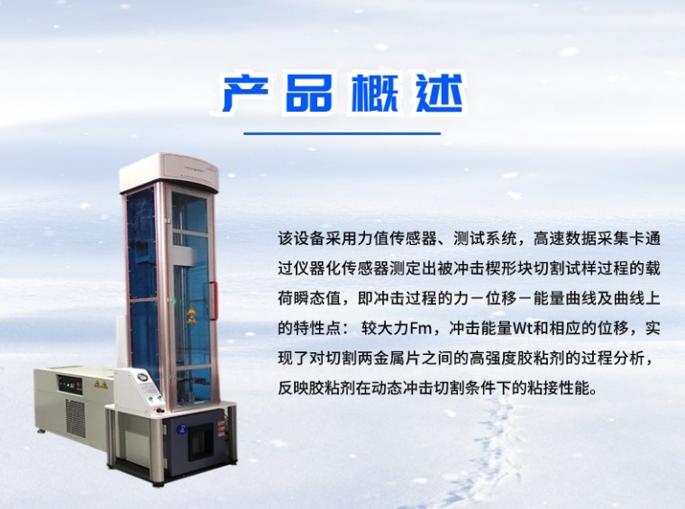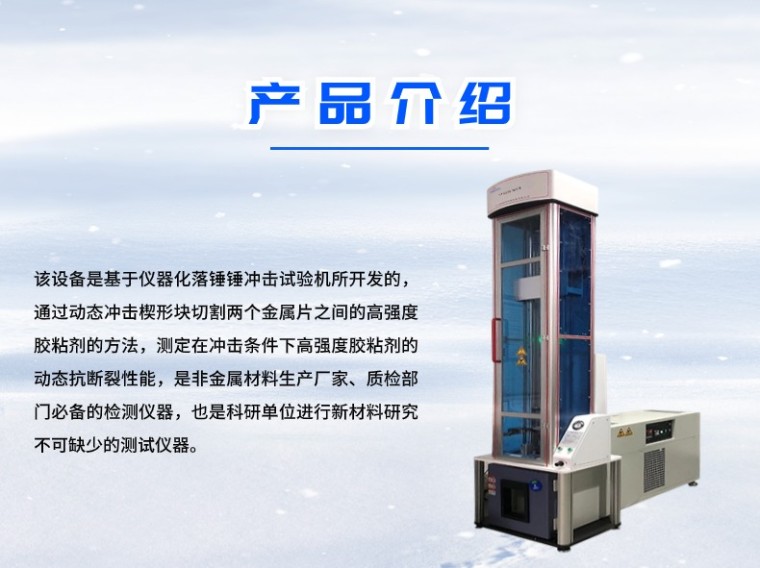 该设备是基于仪器化落锤锤冲击试验机所开发的,通过动态冲击楔形块切割两个金属片之间的高强度胶粘剂的方法,测定在冲击条件下高强度胶粘剂的动态抗断裂性能,是非金属材料生产厂家、质检部门必备的检测仪器,也是科研单位进行新材料研究不可缺少的测试仪器。