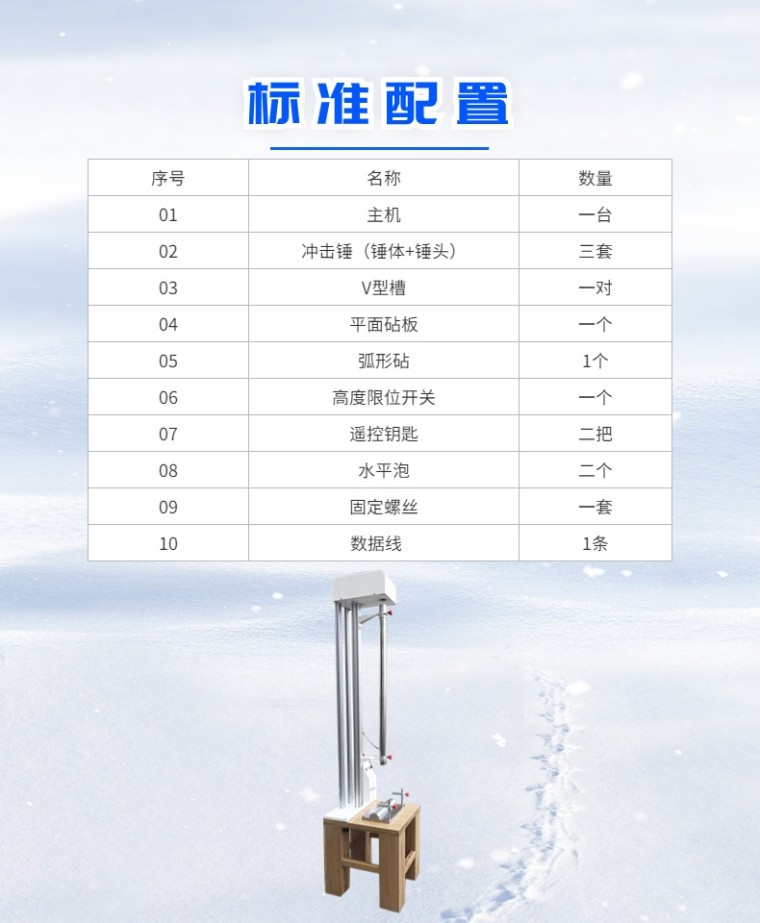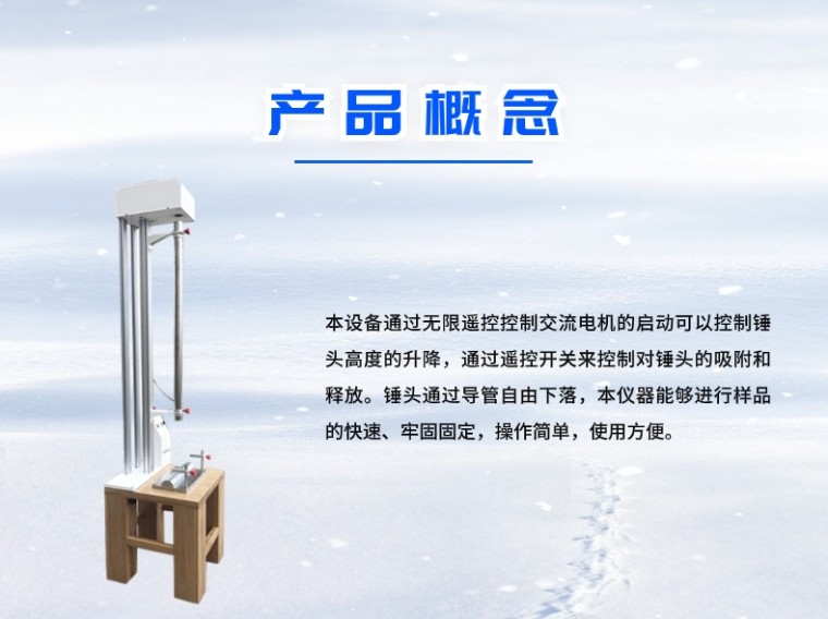 本设备通过无限遥控控制交流电机的启动可以控制锤头高度的升降,通过遥控开关来控制对锤头的吸附和释放。锤头通过导管自由下落,本仪器能够进行样品的快速、牢固固定,操作简单,使用方便。