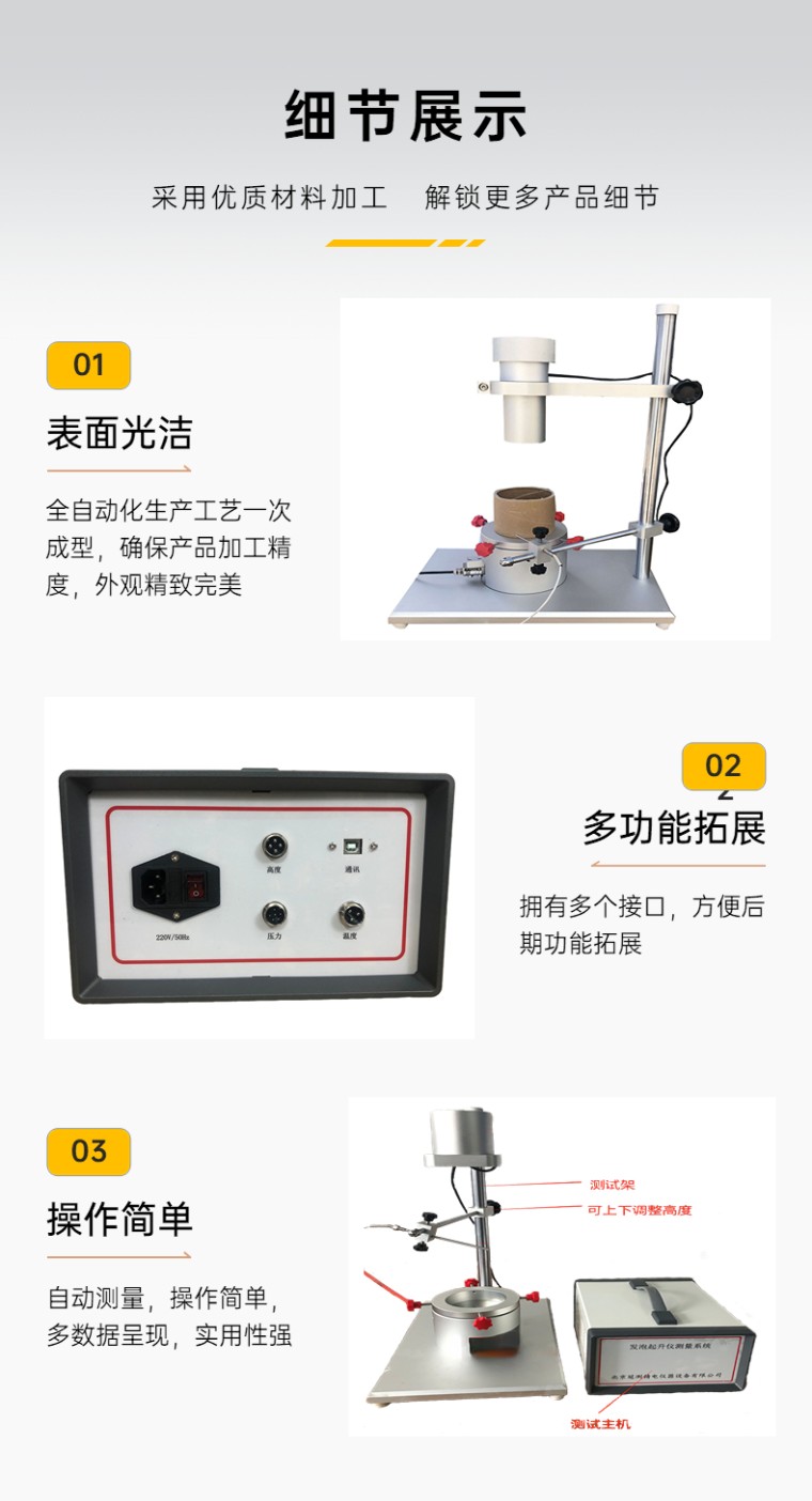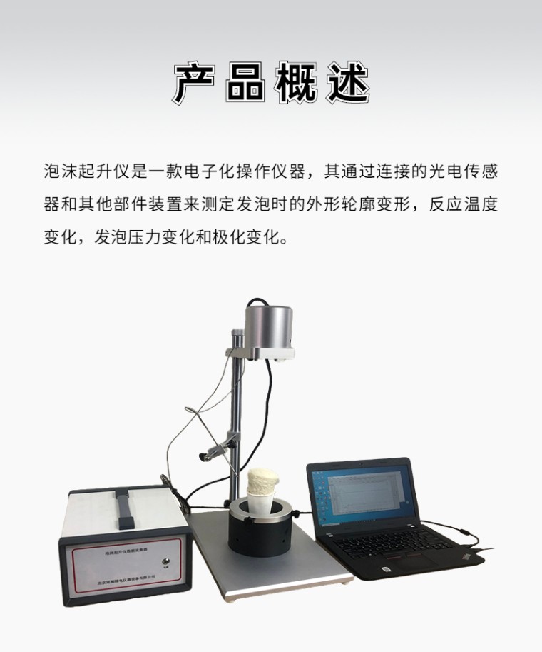 泡沫起升仪是一款电子化操作仪器,其通过连接的光电传感器和其他部件装置来测定发泡时的外形轮廓变形,反应温度变化,发泡压力变化和极化变化。