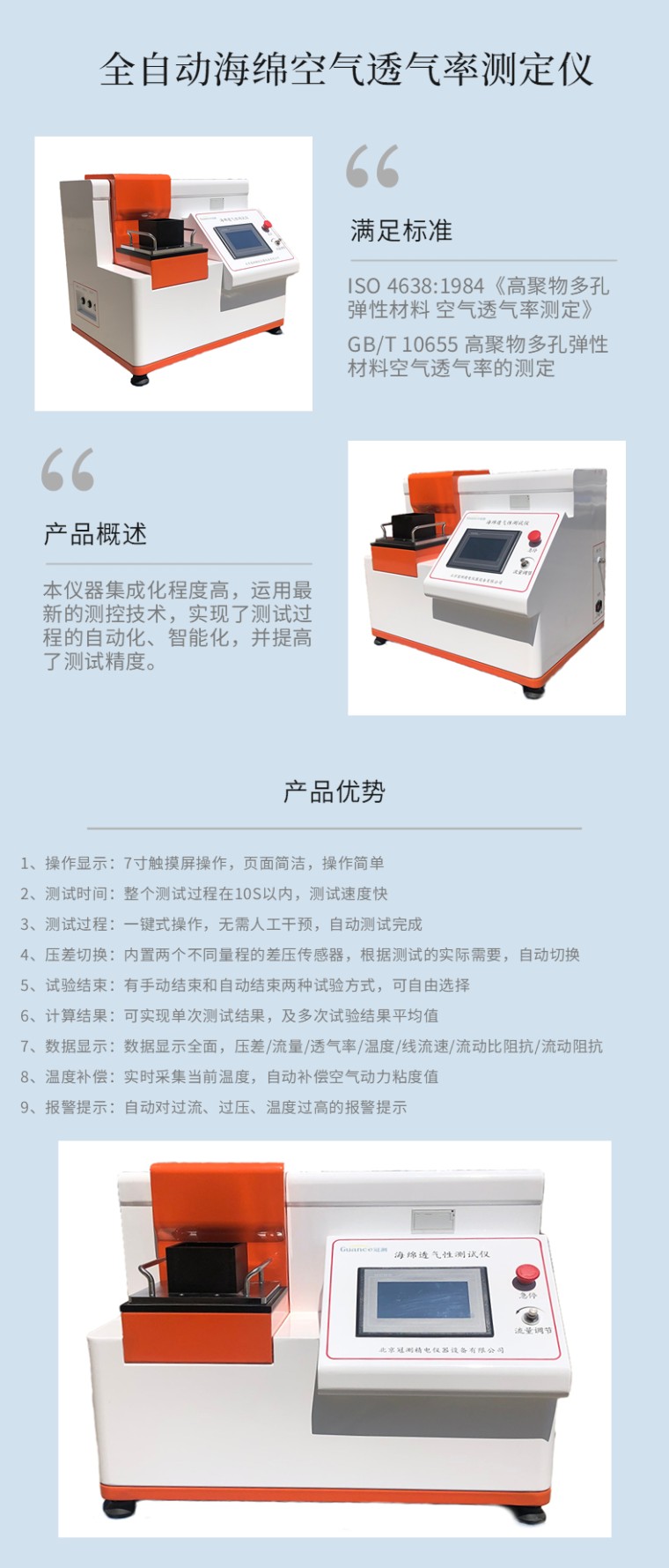 本仪器完全根据国标试验要求,进行研发定制开发,完全替代标准里推荐的RXQ-1型海绵空气透气率测定仪,本仪器集成化程度高,运用*新的测控技术,实现了测试过程的自动化、智能化,并提高了测试精度。通过7寸触摸屏,整个测试过程一键式操作,操作简单,智能便捷,是各大研究机构、科研院所,质检单位进行海绵透气性测定的必备仪器。