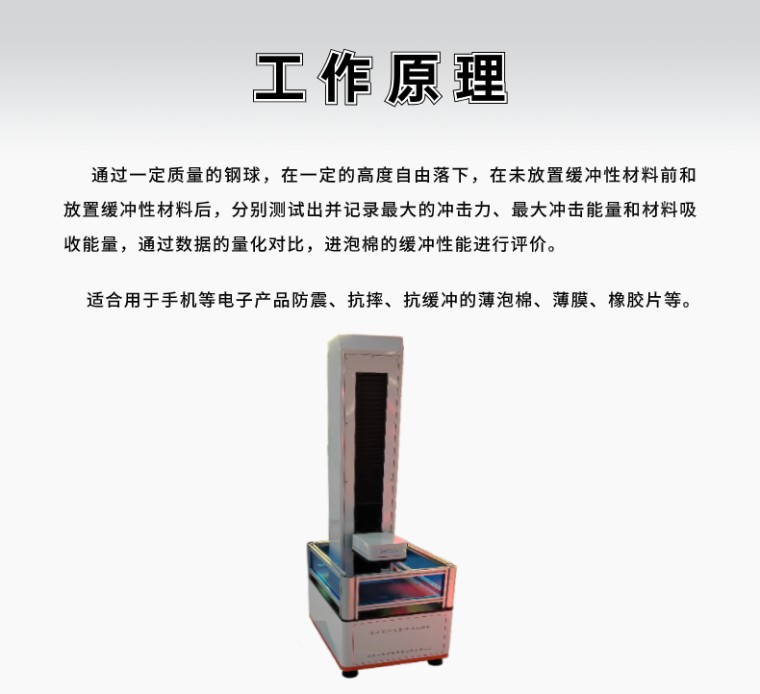 工作原理:通过一定质量的钢球,在一定的高度自由落下,在未放置缓冲性材料前和放置缓冲性材料后,分别测试出并记录*大的冲击力、*大冲击能量和材料吸收能量,通过数据的量化对比,进泡棉的缓冲性能进行评价。