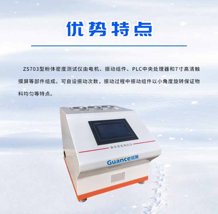ZS703型粉体密度测试仪由电机、振动组件、PLC中央处理器和7寸高清触摸屏等部件组成。可自设振动次数,振动过程中振动组件以小角度旋转保证物料均匀等特点。