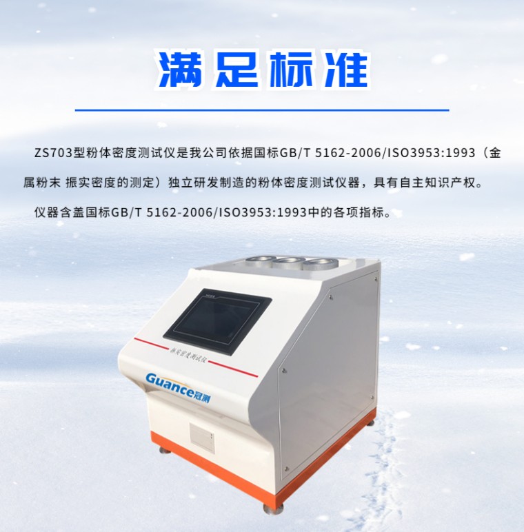ZS703型粉体密度测试仪是我公司依据国标GB/T 5162-2006/ISO3953:1993(金属粉末 振实密度的测定)独立研发制造的粉体密度测试仪器,具有自主知识产权。仪器含盖国标GB/T 5162-2006/ISO3953:1993中的各项指标。