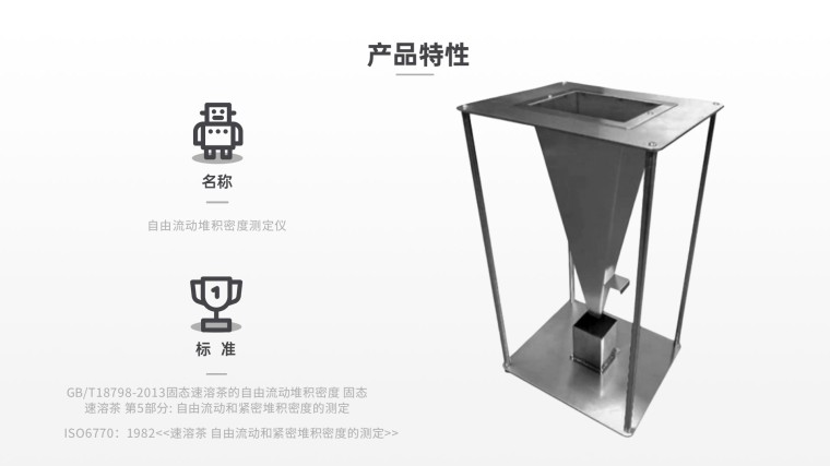 自由流动堆积密度把样品通过一个特定的漏斗注入到一个特定的已知体积和质量的容器中,称量容器的内容物的质量