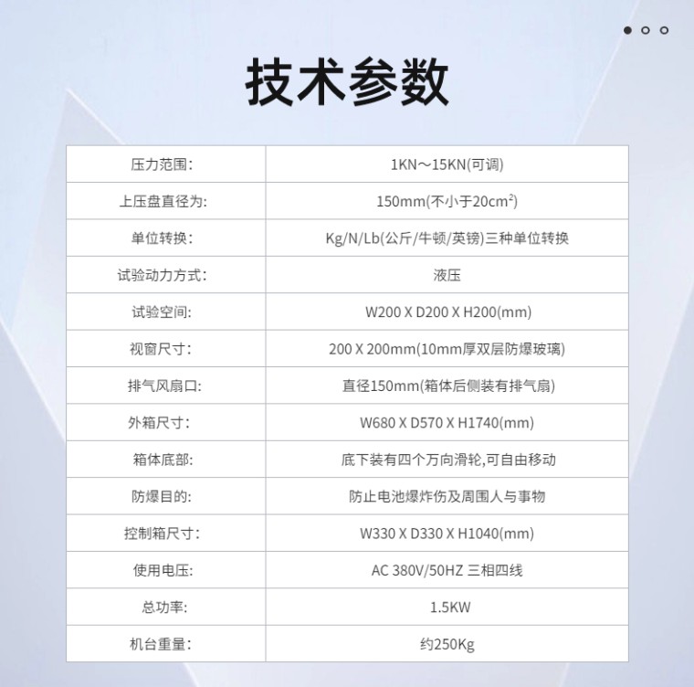 一、用途:通过挤压试验检验电池的**性能,进行试验后电池应不起火,不爆炸;也是各电池厂家及研究所必不可少的检测设备。
