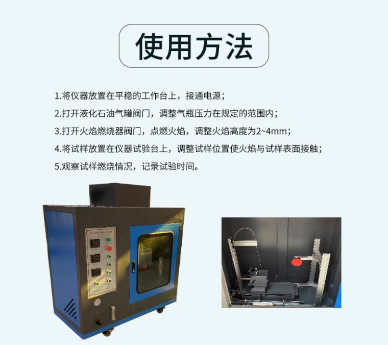 4.将试样放置在仪器试验台上,调整试样位置使火焰与试样表面接触;