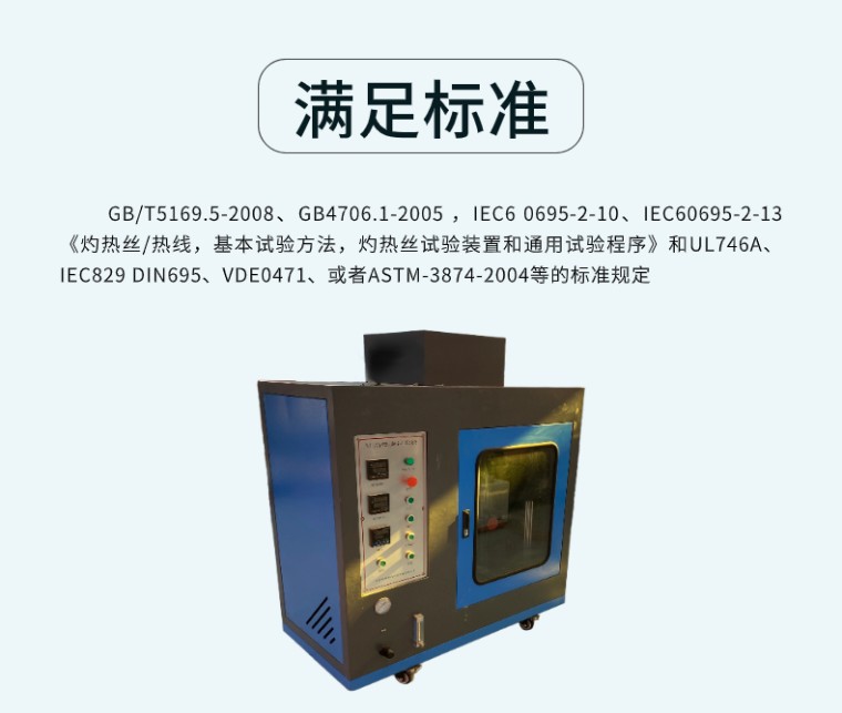 GB/T5169.5-2008、GB4706.1-2005 ,IEC6 0695-2-10、IEC60695-2-13《灼热丝/专线,基本试验方法,灼热丝试验装置和通用试验程序》和UL746A、IEC829 DIN695、VDE0471、或者ASTM-3874-2004等的标准规定
