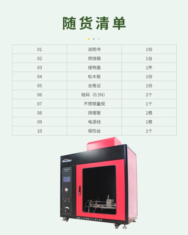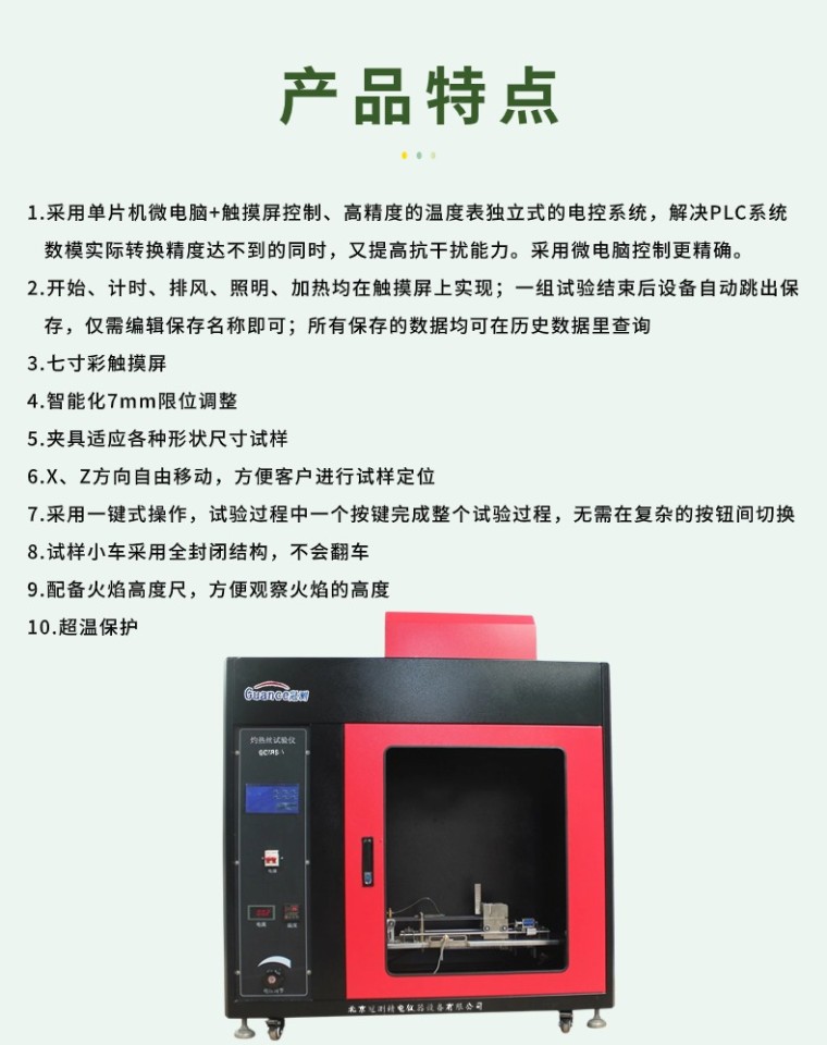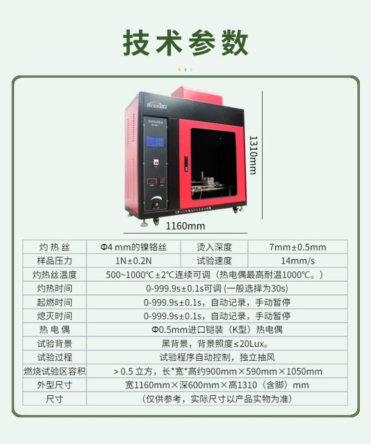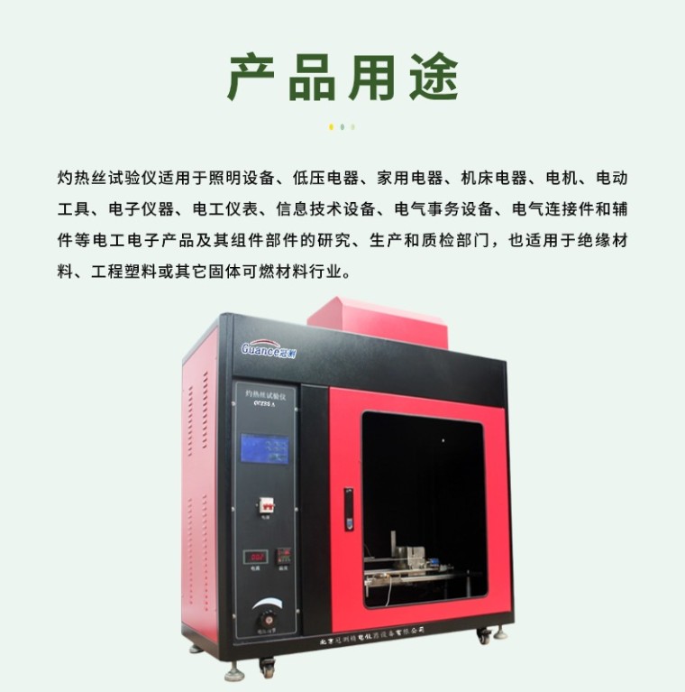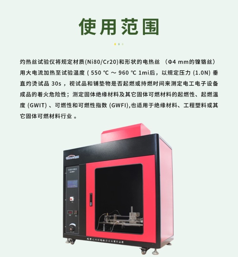 灼热丝试验仪将规定材质(Ni80/Cr20)和形状的电热丝 (Φ4 mm的镍铬丝)用大电流加热至试验温度 ( 550 ℃ ~ 960 ℃ 1mi后,以规定压力 (1.0N) 垂直灼烫试品 30s ,视试品和铺垫物是否起燃或持燃时间来测定电工电子设备成品的着火危险性;测定固体绝缘材料及其它固体可燃材料的起燃性、起燃温度 (GWIT) 、可燃性和可燃性指数 (GWFI),也适用于绝缘材料、工程塑料或其它固体可燃材料行业 。