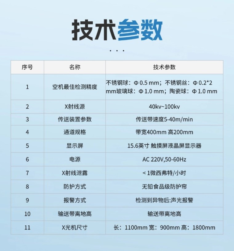 3. 高灵敏度: 可识别微小异物(如≥0.3mm金属丝、≥0.8mm玻璃/石子)。