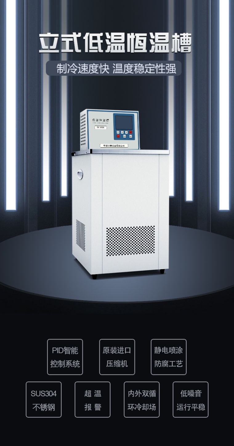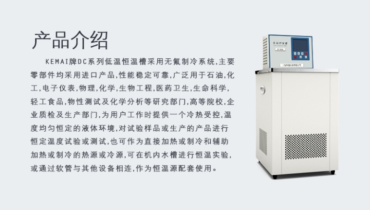 KEMAI牌DC系列低温恒温槽采用无氟制冷系统,主要零部件均采用进口产品,性能稳定可靠,广泛用于石油,化工,电子仪表,物理,化学,生物工程,医药卫生,生命科学,轻工食品,物性测试及化学分析等研究部门,高等院校,企业质检及生产部门,为用户工作时提供一个冷热受控,温度均匀恒定的液体环境,对试验样品或生产的产品进行恒定温度试验或测试,也可作为直接加热或制冷和辅助加热或制冷的热源或冷源,可在机内水槽进行恒温实验或通过软管与其他设备相连,作为恒温源配套使用。