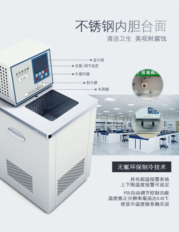 6、专业的循环搅拌设计保证了槽内液体良好的水平和垂直均匀性,容积20L以上低温槽搅拌泵流量10L/in,其余8L/min 温度波动度+0.05℃,显示分辨率0.1℃;