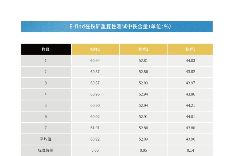 E-find系列仪器可以针对各种类型的矿物通过基本参数法对基体进行校正,且只需简单制样就可以得到高精度的测试结果,与实验室测试结果高度一致;可以针对各种类型的矿物及矿物中多种元素进行高精度分析,可高效快速进行原料或矿样品质评价。