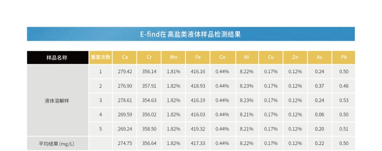 E-find系列仪器可以对新能源中的材料进行高精度分析。如三元锂电池中,可以应用于生产中控环节中原材料高冰镍萃取液、循环水废渣、废液前驱体等样品中的微量元素、主量元素进行准确定量分析;下列是E-find在高盐类液体样品重复检测结果,每个样品2次重复检测,每次检测时间为5分钟。