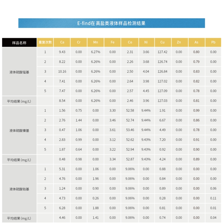 E-find系列仪器可以对新能源中的材料进行高精度分析。如三元锂电池中,可以应用于生产中控环节中原材料高冰镍萃取液、循环水废渣、废液前驱体等样品中的微量元素、主量元素进行准确定量分析;下列是E-find在高盐类液体样品重复检测结果,每个样品2次重复检测,每次检测时间为5分钟。