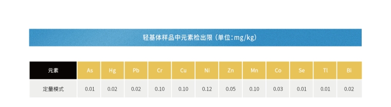 ·适用于As、Ba、Cd、Co、Cr、Cu、Fe、Hg、Mn、Ni、Pb、Pd、Sb、Se、Sn、Ti、Tl、V、Zn等40余种元素快速检测;