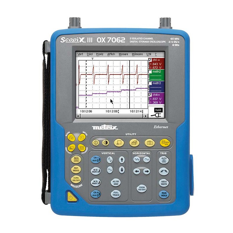 仪器操作简单,通过33个按键,可直接访问所有常用的功能。OX 7062特别适合于现场使用,配有**专利“即插即用”探头等配件,每个测量通道都相互隔离和对地隔离,通过内置WEB服务器和以太网可进行远程控制,集多种仪器功能于一身,包括2通道TRMS万用表。超大320 x 240 全彩LCD显示屏,提供详细的波形细节和所有测量及功能的显示。通过触控笔,可方便快捷地对视窗式菜单进行操作:打开、下拉或执行;触控笔亦可直接作用于图形元素,如游标、触发和缩放等等。