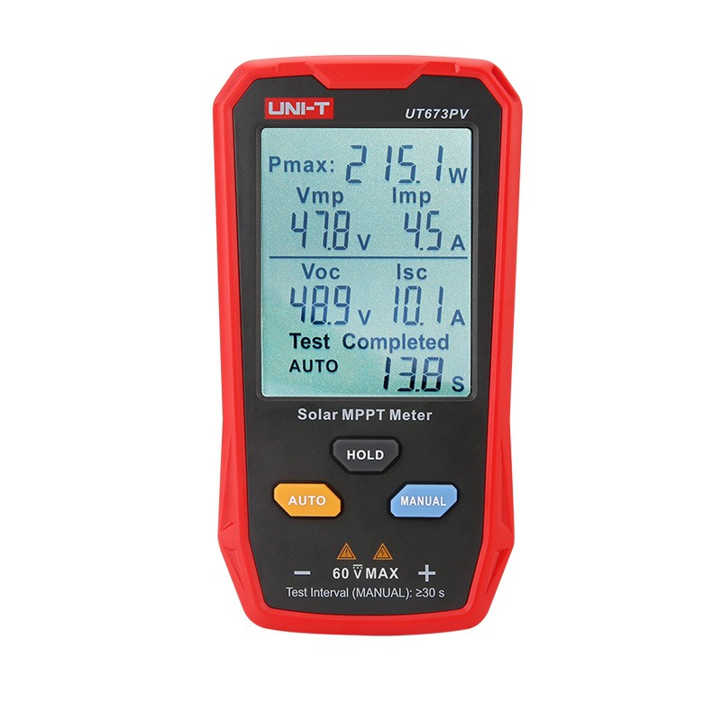 UT673PV产品主要特点 光伏最大功率跟踪点测试:最大功率(Pmax)、峰值功率电压(Vmp)、 峰值功率电流(Imp)、开路电压(Voc)、短路电流(Isc)同时显示, 快速判断光伏组件故障情况 800W最大功率测试,满足行业头部企业大功率双玻组件测试 体积小巧,手掌大小,方便携带 MC4 测试线连接,测量方便可靠 无需电池供电,光伏面板直接供电 CE, cETLus, RoHS认证,测量安全可靠 安全等级:CAT 0 60V |