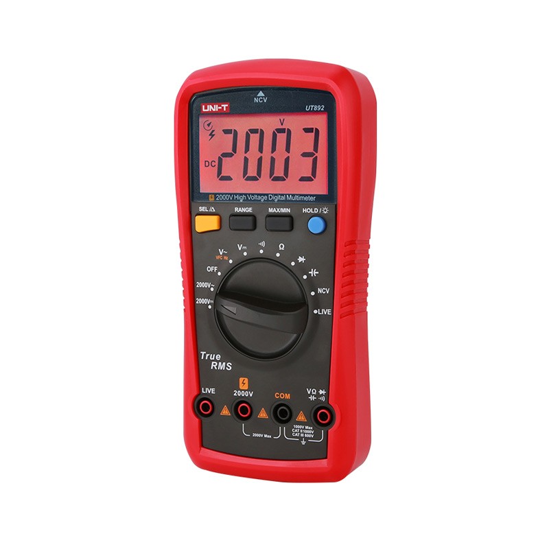 UT892是一款高压测量、真有效值、大屏显示手自一体的万用表;高压检测AC/DC电压可达2000V,同时解决VFC变频电压/频率的测量,能过滤正弦波叠加的载频干扰或各种畸变电压信号,并稳定测量输出电压。具有测量过压、过流报警提示,符合安规CATII 1000V/CATⅢ 600V 要求, 是电子电工高压设备检测优先选择的数字万用表。 广泛应用于:冶炼、通讯、制造、石油、国防、电力、光伏机站等领域。是电力设备检测、维护和维修专用测量工具,更多地解决:煤矿,光伏安装及验收高压检测。