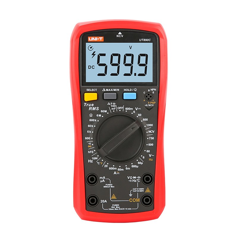 UT890新系列6000计数手动量程真有效值多功能数字万用表,立足于为用户提供更齐全的功能以及更周到的提醒服务,新增自动检测保险丝熔断报警装置及过压、过流报警提示,着重于提醒用户测量过载及保险丝的熔断情况,同时还可以借助此功能来判断保险丝是否已经完好安装。兼备低压频率测量(30V以下,10Hz~10MHz)及高压频率测量(5V~750V,10Hz~10kHz)功能,可以更好应对工频电压的频率测量;LIVE单表笔火线检测功能(仅UT890D+),仅需一根表笔,即可为用户快速区分火零线;高精度温度测量功能(仅UT890C),为从事暖通制冷维修行业的专业技术人员提供精准的温度测量服务。