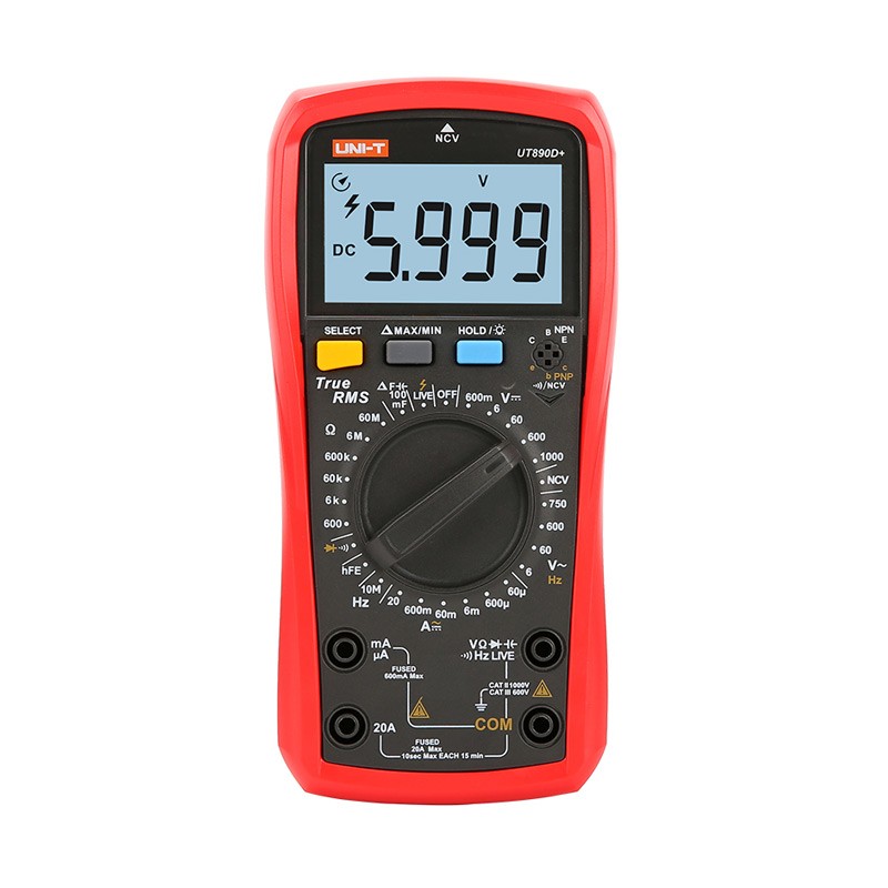 UT890新系列6000计数手动量程真有效值多功能数字万用表,立足于为用户提供更齐全的功能以及更周到的提醒服务,新增自动检测保险丝熔断报警装置及过压、过流报警提示,着重于提醒用户测量过载及保险丝的熔断情况,同时还可以借助此功能来判断保险丝是否已经完好安装。 兼备低压频率测量(30V以下,10Hz~10MHz)及高压频率测量(5V~750V,10Hz~10kHz)功能,可以更好应对工频电压的频率测量;LIVE单表笔火线检测功能(仅UT890D+),仅需一根表笔,即可为用户快速区分火零线;高精度温度测量功能(仅UT890C),为从事暖通制冷维修行业的专业技术人员提供精准的温度测量服务。