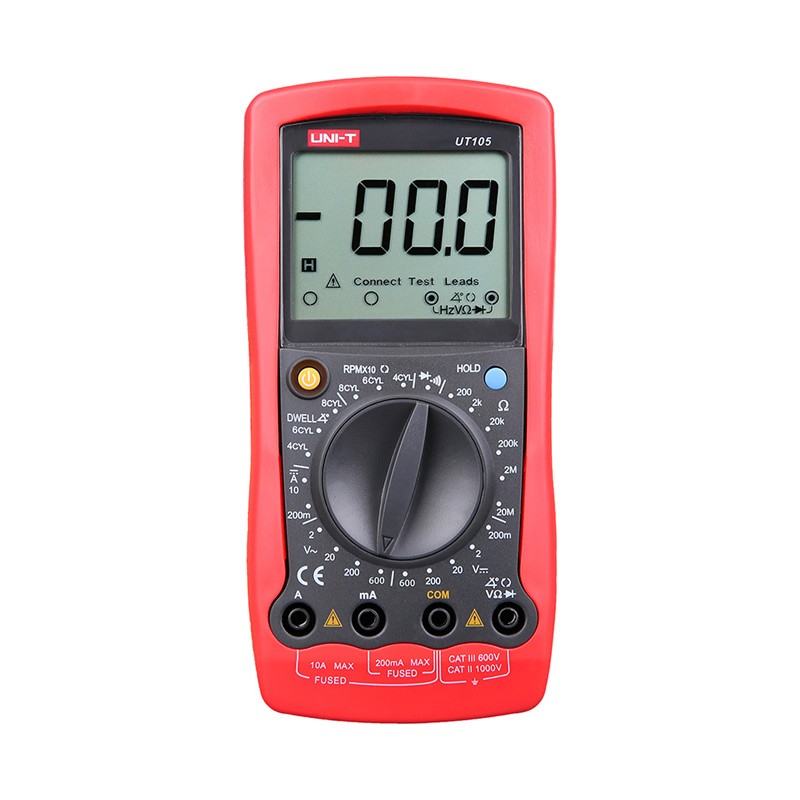 UT105仪表是1999计数的手动量程汽车数字多用表。具有特大屏幕、全功能符号显示及输入连接提示、全量程过载保护和独特的外观设计、使之成为性能更优越使用更安全的电工仪表。本仪表可用于测量:交直流电压、直流电流、电阻、二极管、电路通断及汽车的转速和闭合角。