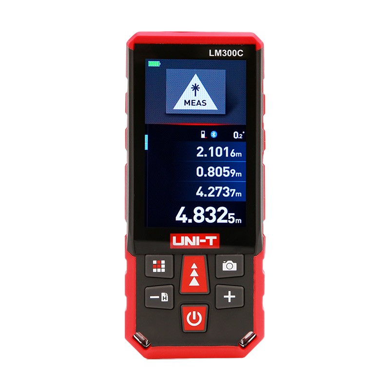LM300C激光测距仪产品主要特点 具备常量设置功能,可手动进行校准; 具有无线充电功能,不在受充电接口的限制 ; 防水防尘结构设计,适应潮湿多尘的恶劣环境使用; 3.0寸高清彩色大屏 ,分辨率高 ,色彩丰富 ,观看舒适; 测量单位毫米、米、英寸、英尺、英尺+英寸可供切换; 多种种测量方式,测量模式多样,满足大多数用户的基本测量需求; 内置找点摄像头,图像清晰,辅助远距离找点 ,更适合户外使用 ; 内置精准陀螺仪 ,实现3D空间测量功能 , 轻松测量任意两点之间的距离 ; 1000组数据及100张截图内容,可直接在机器内读取,也可使用USB连接到电脑导出; 具备蓝牙功能,通过蓝牙连接APP,实时测量及数据共享,协助-个人就能轻松量房; |