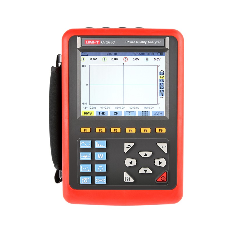 UT285C电能质量分析仪是我公司精心研制的一款专为现场测试的三相、多功能、智能化、人机操作简洁的综合型测试仪器。具有容易使用,超大液晶彩屏显示,高分辨率,中英文双语操作界面,防振结构外壳等特点。可同时测量4路电流(ABC三相及中性线电流),4路电压(ABC三相电压及中性线对地电压)、电流电压的峰值、一段时间内的最大最小值、三相不平衡度、短时电压闪变、变压器K因数、有功功率、无功功率、视在功率、功率因数、位移功率因数、有功电能、无功电能、视在电能、谐波比、总谐波失真度等;显示电流电压的实时波形、相量图、谐波比柱形图;动态捕捉电压电流瞬时变化,监测启动电流,监测各电力参数并生成告警列表,长时间记录测试 数据并生成趋势曲线图等功能。