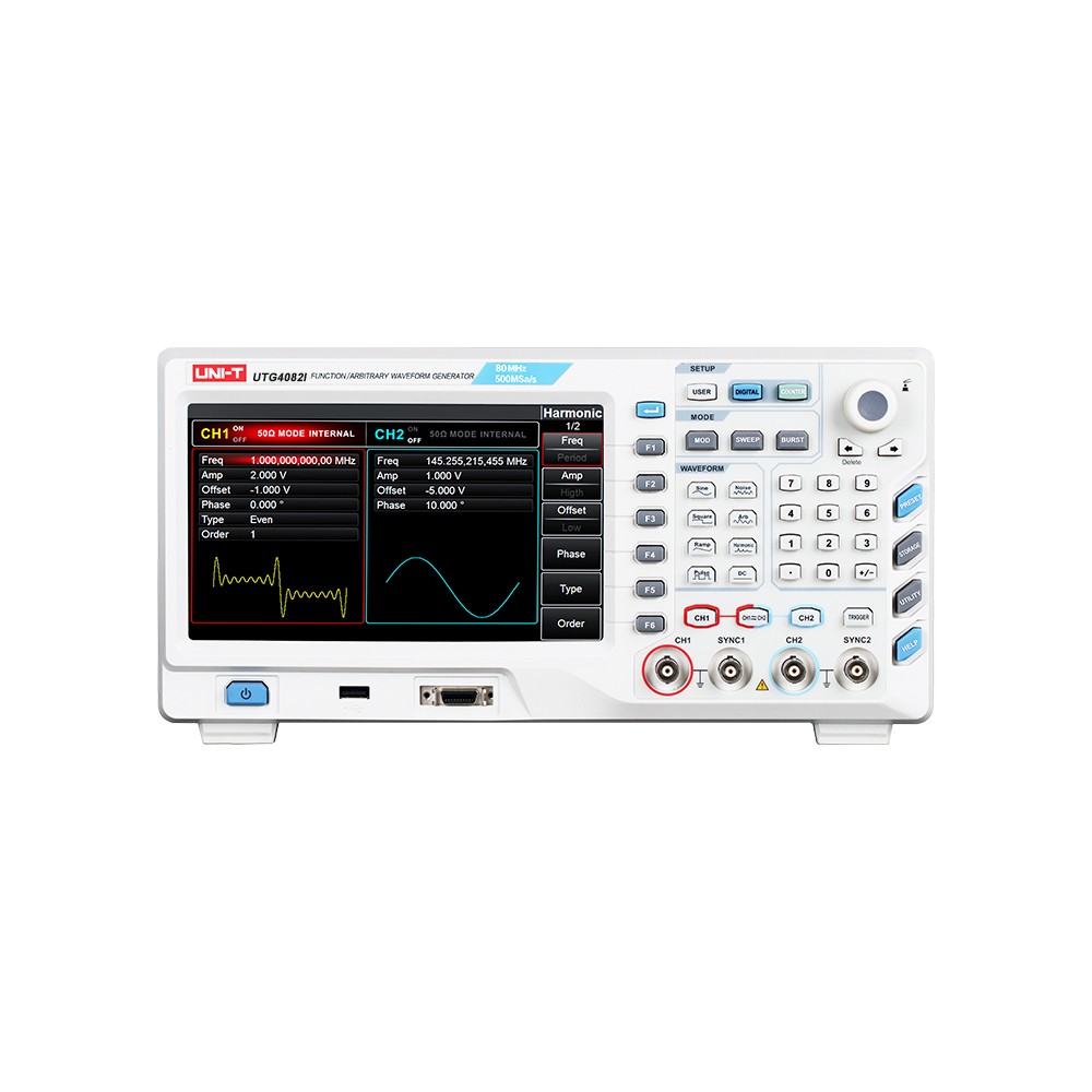 UTG4000I系列集函数发生器、任意波形发生器、脉冲发生器、谐波发生器、模拟/数字调制器、频率计等功能于一体的多功能混合信号发生器;1μHz频率分辨率、以及1mV的幅度分辨率,可生成精确、稳定、纯净、低失真的输出信号,还能提供高频率且具有上升沿和下降沿1ns分辨数字合成的脉冲波。独立等性能双通道设计,最高实时采样率高达500MS/s,最大任意波长度高达32Mpts,同时具备7GB非易失波形存储;国内首款选配数字信号发生器输出模块;超宽8英寸LCD高清屏显示,人性化的界面设计及合理的功能键盘布局,给用户带来更为人性化的使用体验。