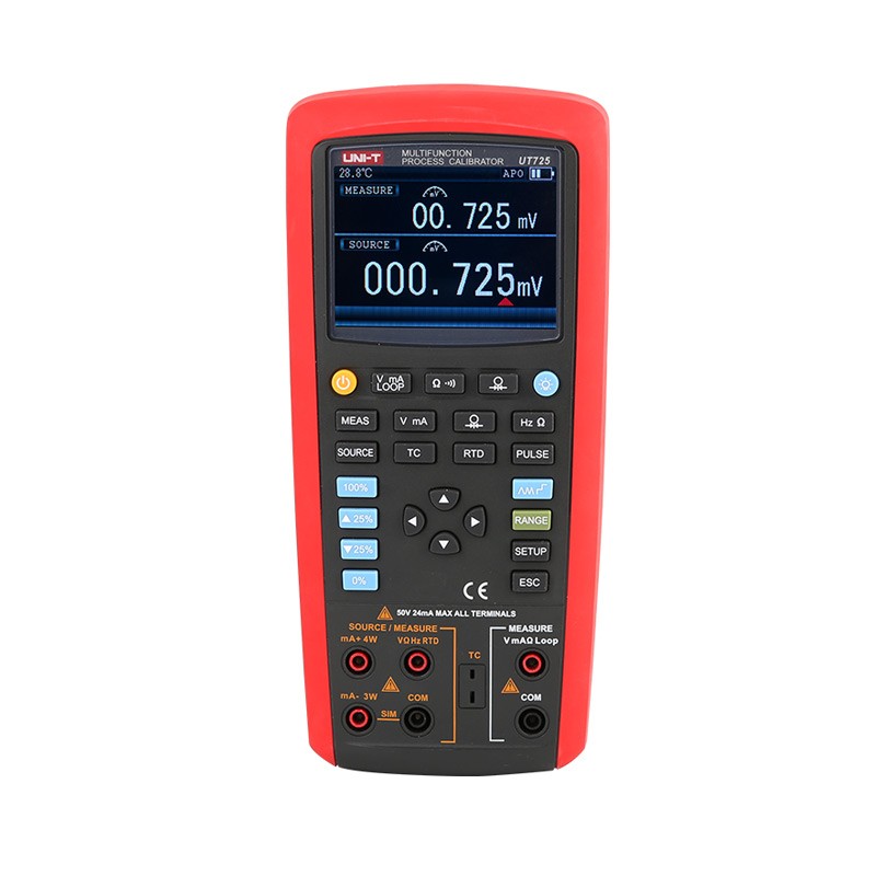 UT725是一款高性能、高精度、手持式、多功能过程校准仪。具有达到0.02%的高精度的直流电流电压输出和测量功能,可对多种电性能和物理性能参数进行测量和输出,具有自动步进和自动斜坡输出功能,可用于快速线性度检测;存储功能使得系统设置更加快捷;数 据传输功能使用户可快速进行测试通讯。支持两路信号处理,屏幕上部可显示测试电压、电流(环路供电)、电阻、压力。屏幕下部可显示测量或输出的电压、电流、频率、电阻、压力,以及以温度形式显示的热电阻(RTD)、热电偶(TC)。