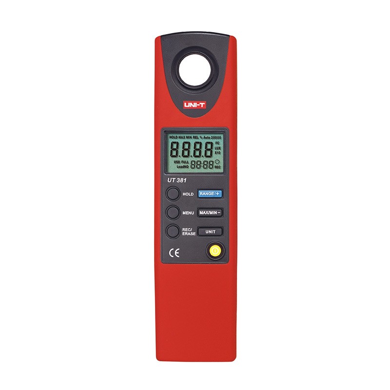 UT381产品主要特点 自动与手动量程选择 数据保持 自动关机功能(可设置取消) MAX/MIN:最大值、最小值 数据存储,可设置自动或手动存储/查阅 2044条数据 USB数据传输,支持与PC通讯 具有实时时钟显示和记录间隔设置(0.5-255秒可调) 恢复出厂设置功能 两种测量单位选择(LUX/FC) 仪表符合CE欧洲共同体(European Union)标准 |
