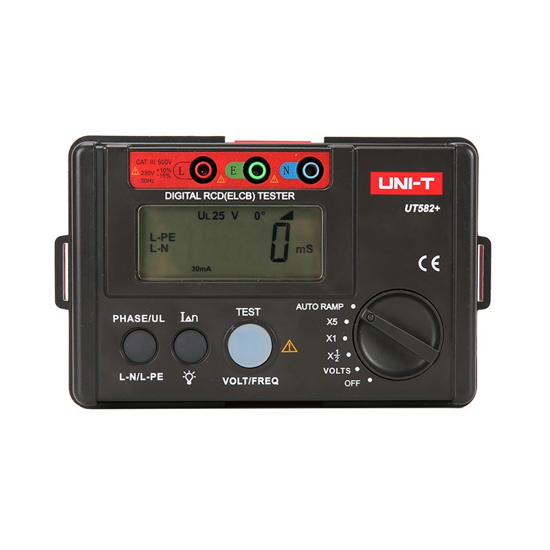 UT582+漏电保护开关测试仪采用智能微处理器芯片控制,具有高精度,高可靠性和高稳定性。具有同时测试故障动作时间和动作电流的AUTO RAMP功能。根据LCD符号提示,有接线检查指示。测试完成以后,自动保持显示测量结果。有0°和180°相位选择,可检测出最快触发时间。超量程有“OL”显示。新增电压测量功能,采取电池供电,配有FUSE安全保护,双重绝缘或强化绝缘安全构造;具备CAT III 600V安规等级。