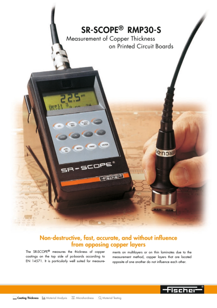 该便携式设备采用 4 点电阻法,十分适合测量多层电路板上薄镀层的厚度。这种电路板上的多层铜镀层通常被环氧树脂等绝缘体隔开。SR-SCOPE 的优势是利用电阻法测量不会受到其他层的影响,因此能够精确测定上层面铜层的厚度。特性: