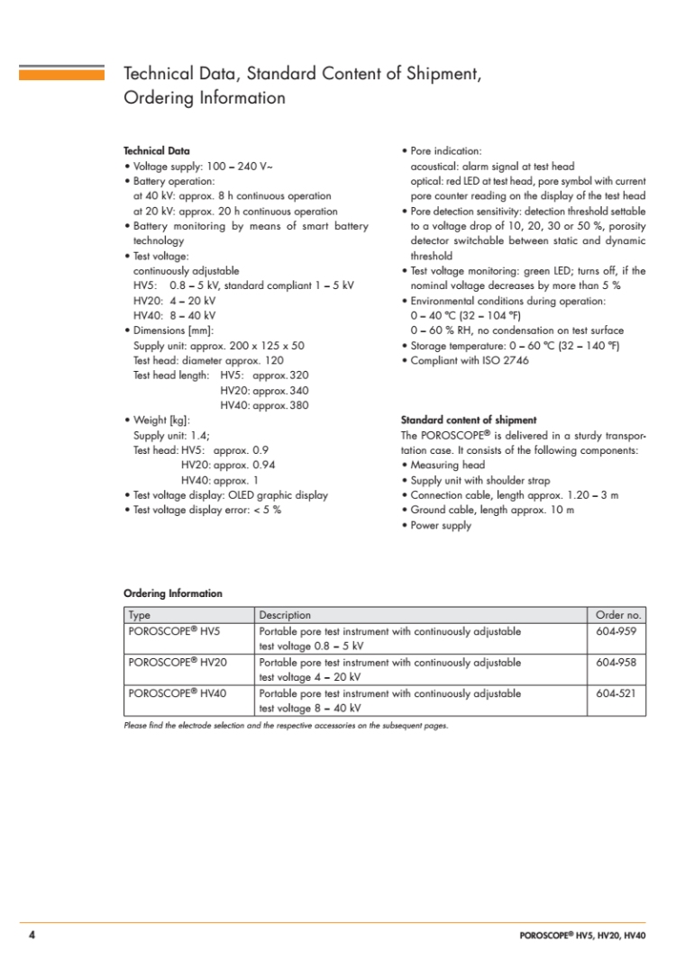 提供三个电压范围:0.5 - 0.8 kV (POROSCOPE HV5)、4 - 20 kV (POROSCOPE HV20) 以及 8 - 20 kV (POROSCOPE HV40)
