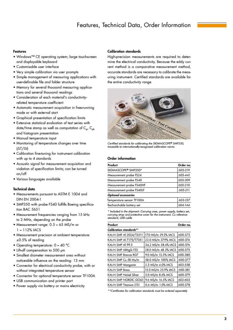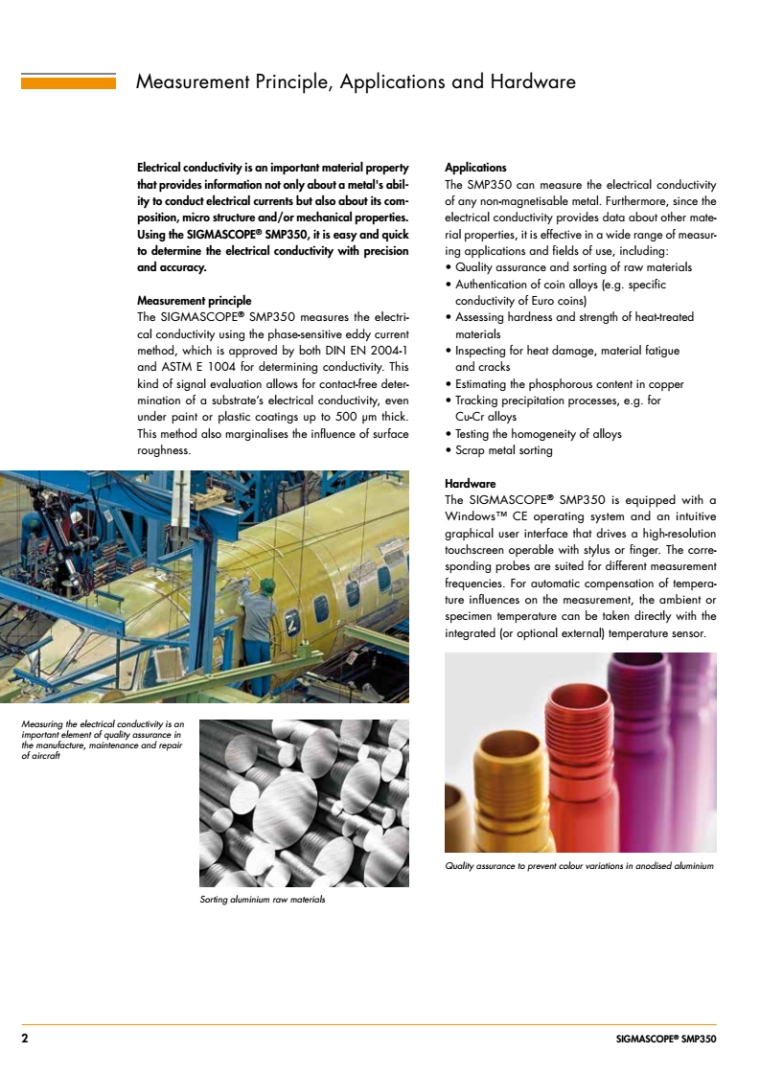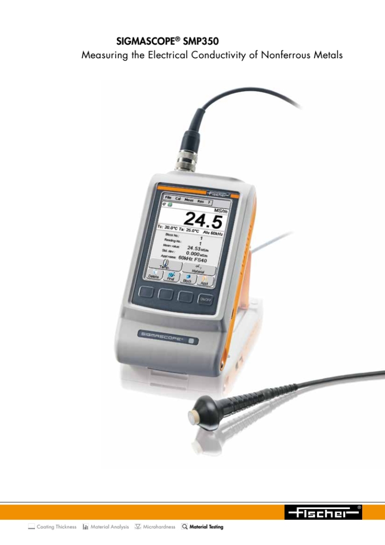SIGMASCOPE SMP350 是一款结构紧凑的手持式设备,适用于测定非铁磁性金属(如铝或铜)的电导率。通过测得的电导率能够进一步得出与热处理材料的硬度与强度相关的结论。从而建立热损伤与材料疲劳的证据。为此仪器使用了相敏涡流法。该方法经认证可用于符合标准 DIN EN 2004-1 与 ASTM E 1004 的电导率测量。特性: