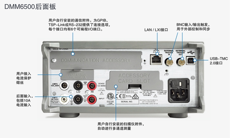 ● 选配的用户自行安装的通信接口包括:GPIB、TSP-Link®和RS-232
