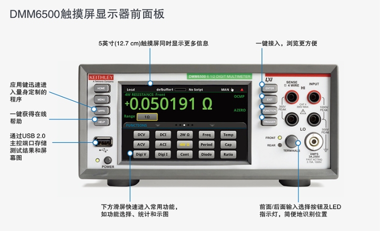 DMM6500 是一种现代化台式/ 系统DMM,提供了更多的测量功能、同类***的测量能力,而且价格就不会超出您的预算。DMM6500 最**的特点是5 英寸(12.7 cm) 容性大触摸屏显示器,可以使用手势体感,简便地观察、互动及浏览测量数据。除显示技术外,DMM 6500 杰出的模拟测量性能提供了杰出的准确度,一年期基本DCV 准确度为25PPM,两年期基本DCV 准确度为30 PPM,可望延长您的校准周期。