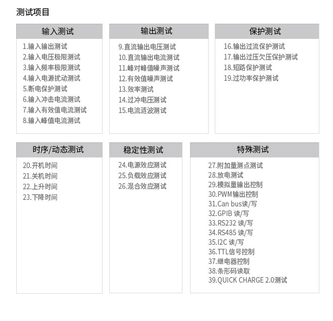 ITS9500 系列电源自动测试系统是一款方便实用的测试系统,小体积仅5U,可提供超越传统大型机柜测试系统性能的测试结果,帮助客户大幅度节约空间并压缩成本。可以支持多8路电源同时进行测试,得力于ITECH丰富的电源及负载产品线,用户可根据需求挑选适合自身的仪器设备来搭建测试系统,为系统的架构提供了大的弹性与可扩展性。系统提供超过80项的测试项,用户可以根据待测物的特性,选择测试项目,轻松完成测试。广泛应用于测试AC及DC电源供应器、电源转换器、充电器、车载充电机等产品之测试
