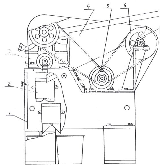 1,机体 2,缩分器 3,破碎机器 4,振筛机 5,电机 6,机械传动