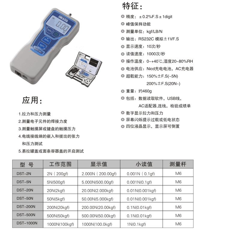 推拉力计用于各种产品的推拉负荷测试、插拔力测试、破坏试验等,可对物体进行拉力测试、压力测试、插拔力测试、裂开力测试、拉开力测试、拉开强度测试、弯曲力测试、剥离力测试、延伸力测试、硬度测试、破断力测试和开关拔动力测试。