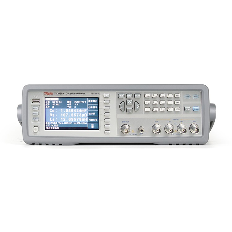 TH2638 是用于陶瓷电容生产测试的一款电容表。TH2638 可用于在频率 100Hz,120Hz, 1kHz,10kHz,40kHz, 100kHz,1MHz 和测试信号电平(0.1V ∼1V)对陶瓷电容作出评估。