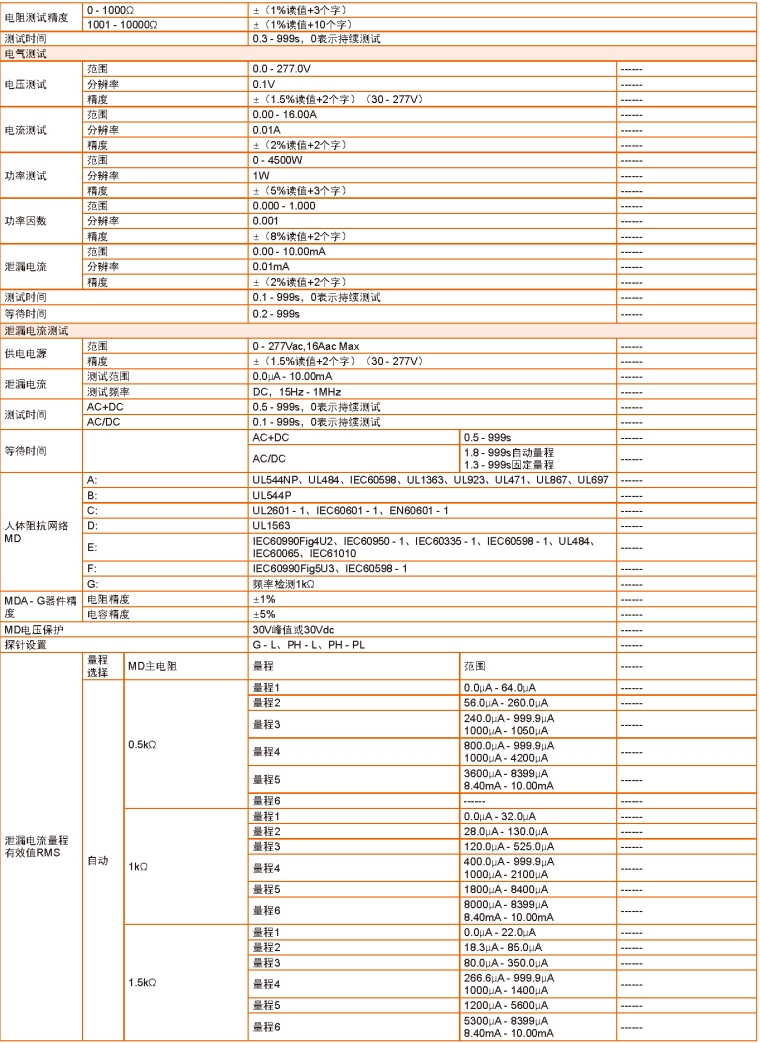 电气测试 | 电压 | 0.0-277.0V | 可作为交流电源输出,输出功率500VA 同时测量电压、电流、功率、功率因数、泄漏电流等参数 测量参数可设定上下限进行判断 |