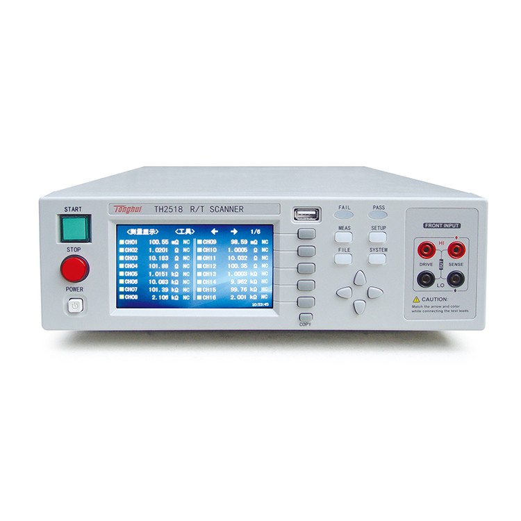 同惠TH2518系列电阻/温度扫描仪模拟测试扫描单元采用同步插卡式的设计理念,可支持的插卡板测试单元可达6个,且在插卡板之间实现同步测量,大大提高扫描测量速度。每块测量板内包含16个测试端,测试端的组合支持用户可自由编程,最高可配置高达90路电阻/温度扫描测量通道,每通道测量可单独设计分选比较边界以及输出比较分选信号。温度测量的采样方式可配置为PT500铂电阻、PT100铂电阻、模拟电压输入三种方式以适用不同的应用场合。0.05%的最高电阻精度,在200mΩ量程下,电阻分辨率更是达到了10uΩ的水准,测试扫描范围从10uΩ到200kΩ。仪器的温度补偿和温度转换功能使产品的测试免除环境温度的影响,可输出整机级、板级以及各通道的比较分选结果,使您的测试和数据分析处理、产品的分拣工作更加轻松。标配的RS232、USB HOST、USB Device和HANDLER接口既方便您测量数据的快速保存,又方便您远程的掌控仪器。带触摸功能的24位色、分辨率为480×272的彩色液晶屏,给您的测量操作带来不一样的感觉!